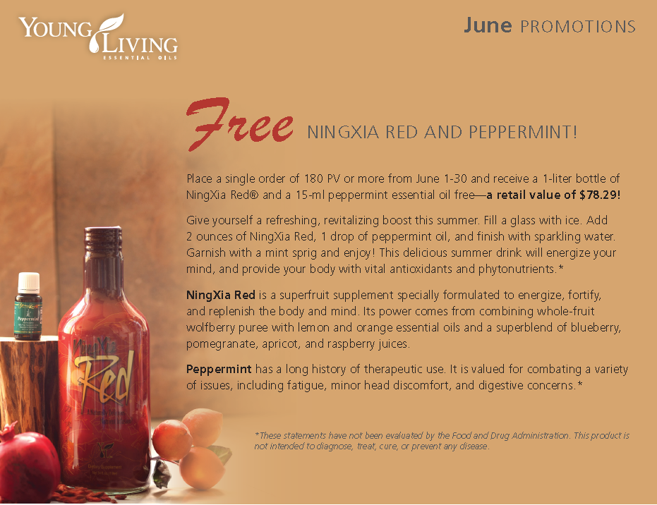 Go to our store and place a retail order for approximately $237. Your FREE NingXia Red and peppermint oil will be automatically added to your order. If you prefer to set up your own account and receive a 24% discount on all products, order the Start Living with Everyday Oils kit and approximately $86 retail value in other products to receive the promotional products. Another option is the Start Living with NingXia Red kit and you would only need to order approximately $40 retail value in other products to receive the promotion.
